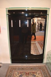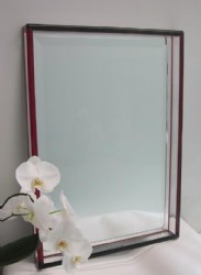 Spiegelrahmen aus 19mm Kristallglas Superweiß, Kanten halbrund geschliffen, poliert und in Gehrung UV-verklebt. Je nach Ansichtslinie spielt der Rahmen auf raffinierte Art und Weise mit Lackeffekten in rot und schwarz.